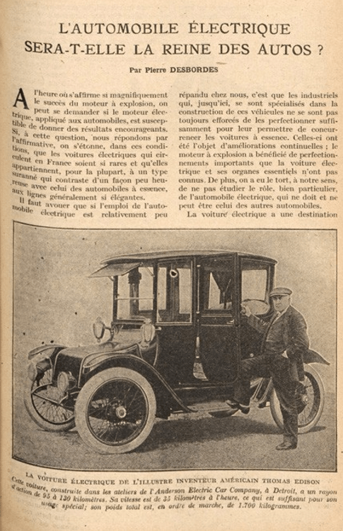 Pierre Desbordes, « L’automobile électrique sera-t-elle la reine des autos ? », La Science et la Vie, t. XV, nº 43, février- mars 1919, p. 213