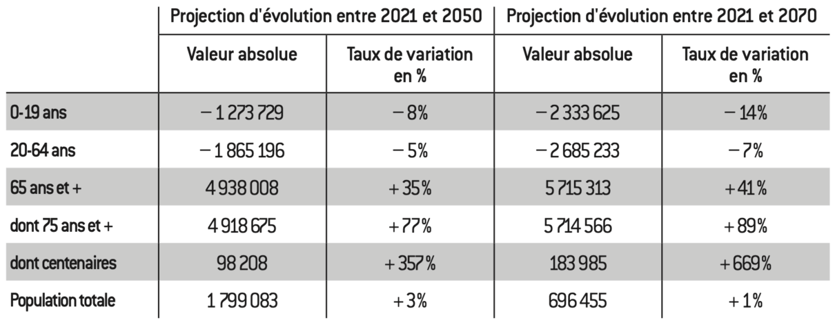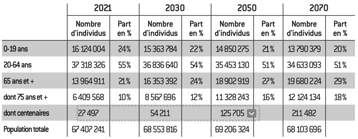 Selon les données de l’Insee, entre 2021 et 2050 la population française âgée de 65 ans et plus devrait croître de plus de 35% (+4,9 millions), et représenter plus d’un quart de la population totale en 2050. Parallèlement, le nombre de centenaires (31.644 en 2024) devrait doubler d’ici à 2040 (76.000) et quadrupler d’ici à 2050 (125.705).