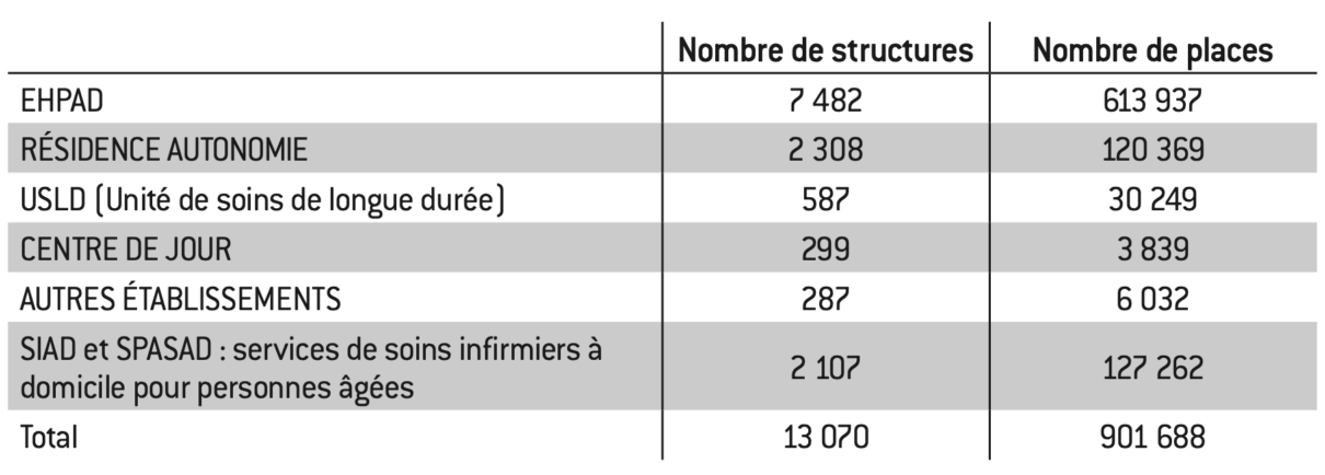 Un décompte de la Drees donne des quelque 13.000 structures et 900.000 places destinées aux personnes âgées vulnérables la distribution suivante :