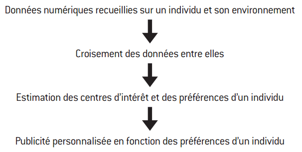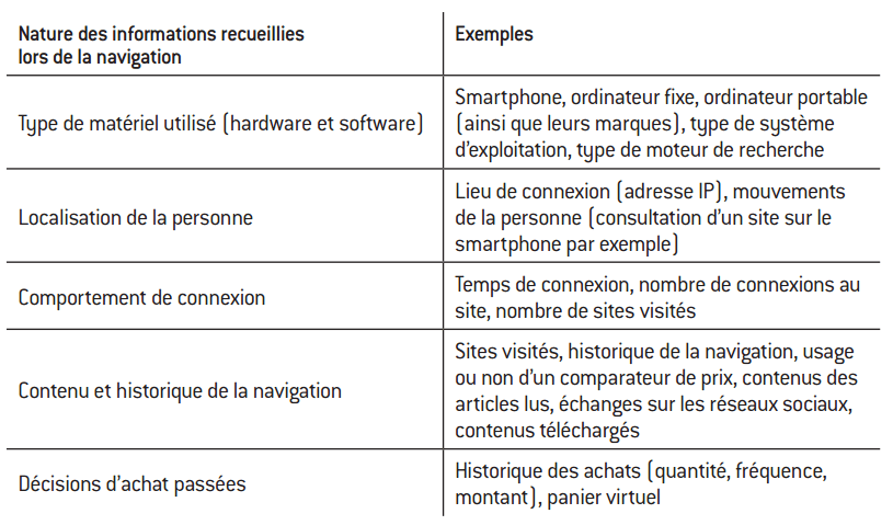 Dans le cas particulier de Facebook, il transmet non seulement des données déclaratives sur sa situation objective (sexe, âge, lieu de résidence, etc.), mais également sur ses préférences, en fonction par exemple des sujets qu’il aime aborder dans ses conversations. Il est également possible de connaître l’ensemble des contacts des personnes connectées et leur localisation géographique. Lorsque le client navigue sur Internet sans pour autant se « loguer » à un site, il transmet également au moteur de recherche (principalement Google) et/ou aux sites visités, de manière involontaire, de multiples données, via notamment les cookies, sur son comportement de navigation : historique des sites visités, temps passé sur chaque site, produits regardés ou achetés, etc.19 La richesse du big data réside non seulement dans l’accumulation de données mais, surtout, dans leur croisement, qui permet de dresser un « portrait-robot » assez précis d’un client.