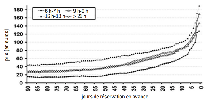 Une étude de 2009 a ainsi montré que le prix d’un billet sur la compagnie Ryanair, pour un même vol, augmentait de manière quasi continue au cours du temps. L’amplitude de la hausse de prix est forte : le prix d’un billet peut atteindre 180 euros le jour du départ, soit six fois le prix observé trois mois auparavant (30 euros).