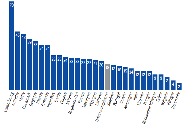 Part d’achats effectués en ligne sur des sites internet d’un autre pays de l’UE en 2016 (en %)