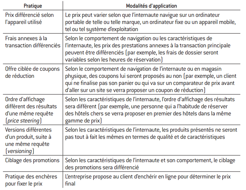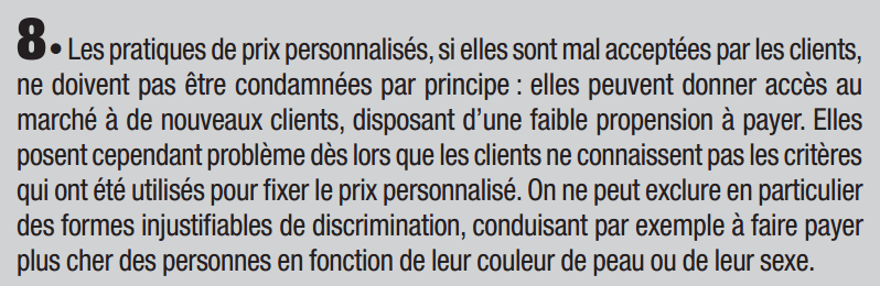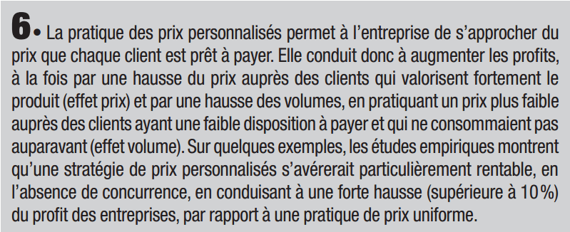 Toutefois, avec le développement du numérique, la discrimination par les prix pourrait demain franchir un pas décisif en incitant les entreprises à pratiquer des prix personnalisés : grâce au big data, chaque client se verrait proposer un prix particulier, en fonction de sa disposition individuelle à payer. L’ère du prix uniforme, sur lequel s’est fondée toute la grande distribution depuis plus d’un siècle, pourrait progressivement céder la place à un univers de prix « à la tête du client ». Cette pratique de discrimination serait certes très rentable pour les entreprises mais elle risque toutefois de susciter la défiance des clients, ces derniers ne sachant souvent pas quels critères utilisent les algorithmes pour fixer le prix. C’est donc avec une certaine prudence que les entreprises devraient explorer les possibilités de prix personnalisés, au travers de pratiques subtiles et indirectes, telles que les rabais ciblés, l’affichage différencié des résultats d’une requête (price steering) ou la participation des clients à des enchères.