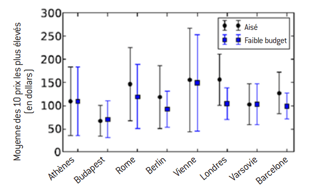 Prix des chambres d’hôtel pour les 10 premiers résultats affichés, en fonction de deux profils de clients