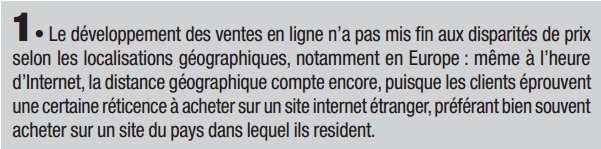 En 2012, des chercheurs ont montré qu’à l’intérieur même des États-Unis il existe des écarts de prix significatifs pour un même produit selon la localisation géographique de l’internaute : pour des produits tels que les jeux vidéo en version numérique, ces écarts peuvent atteindre 166% pour un même produit, alors même qu’il n’existe pas de différences de coûts de transport, puisque les jeux sont téléchargés en ligne12. Il est donc possible, même à l’heure du e-commerce, de continuer à pratiquer des prix différenciés selon les localisations sans risquer que tous les clients procèdent à des arbitrages dans l’espace.