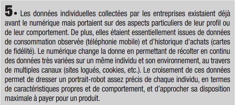 Les entreprises n’ont pas attendu l’avènement du numérique pour disposer d’informations individuelles sur le comportement et les préférences de leurs clients, en particulier dans le secteur du commerce de détail et des services à la personne. En effet, les grandes chaînes de distribution physique (alimentaires ou culturelles) et les compagnies aériennes ont accès depuis longtemps, via leurs programmes de fidélité, leurs cartes de paiement ou d’abonnement, à de précieuses informations sur leurs clients. De même, les banques de détail ou les opérateurs téléphoniques disposent de données précises et récurrentes, que ce soit sur les revenus et les comportements d’achat des clients ou sur leur localisation géographique. Ces informations, pour utiles qu’elles soient, présentent toutefois deux limites :