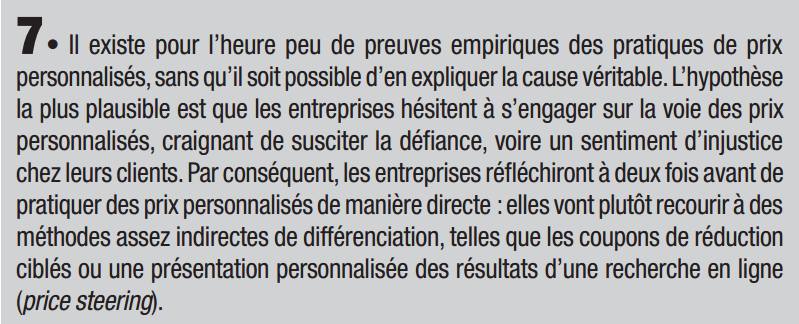 On notera toutefois que l’existence d’un « prix de référence », si elle est courante dans la distribution de biens physiques, est moins fréquente dans le domaine des services à la personne, comme les prêts immobiliers ou l’assurance : on peut donc estimer que les prix personnalisés, qui existent déjà en pratique, seront mieux acceptés dans les services, compte tenu de l’absence de référentiel unique et de la nécessaire prise en compte du profil de risque de chaque client.