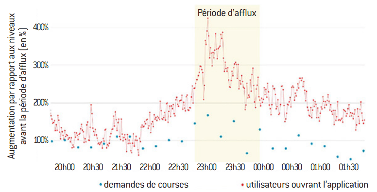Au-delà de l’aérien, les pratiques de tarification dynamique se développent aujourd’hui dans des industries caractérisées par des contraintes de capacité et de fortes fluctuations de la demande, à l’image des véhicules de transport avec chauffeur (VTC). Ainsi, une entreprise comme Uber fait varier le prix de la course au départ d’une localisation donnée en fonction de l’offre et de la demande à un instant t, avec un système de tarification des heures de pointe (surge pricing). À titre d’exemple, le 21 mars 2015, lorsque le concert de la chanteuse Ariana Grande à Madison Square s’est terminé à 22h30, la demande de courses a soudainement augmenté, conduisant à une très forte hausse du prix, pouvant atteindre jusqu’à 400%. Cette hausse de la demande a par la suite entraîné une augmentation de l’offre, un nombre accru de chauffeurs rentrant alors sur le marché pour satisfaire la demande, conduisant à une baisse du prix pour le consommateur.