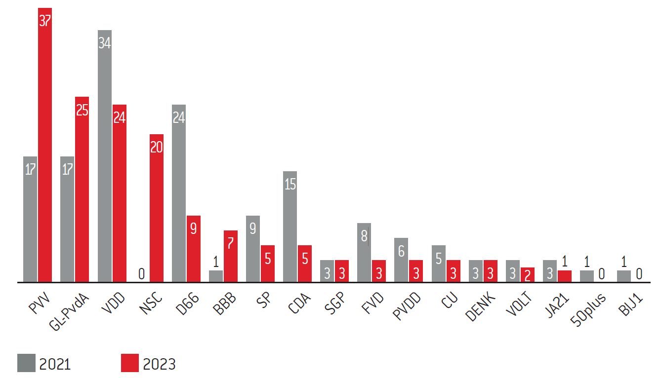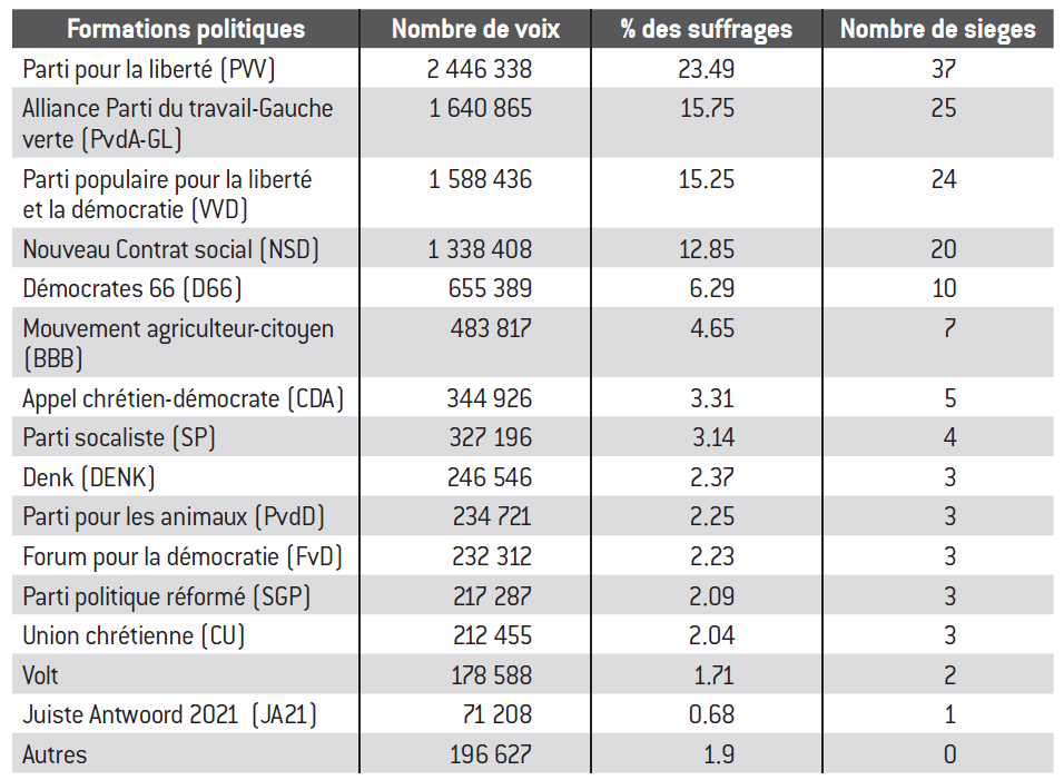 La tonalité générale des commentaires qui ont suivi, tant aux Pays-Bas qu’à l’étranger, les dernières élections néerlandaises du 22 novembre 2023 a été celle de la « surprise » devant la large victoire du parti d’extrême droite, le PVV de Geert Wilders. Avec 23,5% des voix et 37 sièges dans un mode de scrutin intégralement proportionnel, cette formation, créée en 2006, a connu un succès sans précédent dans son histoire et a plus que doublé son résultat par rapport aux élections précédentes de 2021.