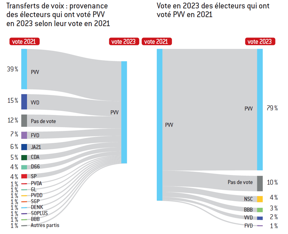 Sans doute, les aléas de la campagne ont-ils contribué à l’ample victoire de Geert Wilders. Il faut toutefois écarter d’emblée la fausse piste de la « complaisance » du VVD à son égard, thème souvent entendu dans les commentaires à la suite de l’ouverture faite au mois d’août par la nouvelle tête de liste des libéraux, Dilan Yesilgös, qui avait alors envisagé une collaboration avec le PVV. Or, le décollage de ce dernier s’est produit seulement à partir de la mi-septembre pour s’accélérer brutalement à la mi-novembre : 20 sièges le 14 et 28 le 21. Voilà qui invite à regarder de près les dernières semaines de la campagne. Or, au début novembre, la leader libérale était revenue sur sa déclaration du mois d’août et avait exclu de gouverner avec Wilders comme Premier ministre, position répétée le 21. Le lendemain, le PVV atteignait 37 sièges dans les urnes. Autrement dit, au vu de la chronologie, son envolée finale s’expliquerait plutôt par cette dernière position négative du VVD : phénomène confirmé par les importants transferts de voix de ce parti vers le PVV lors du scrutin, renvoyant à l’inclination de la majorité de son électorat en faveur d’une coalition clairement à droite après les déboires du cabinet Rutte IV.