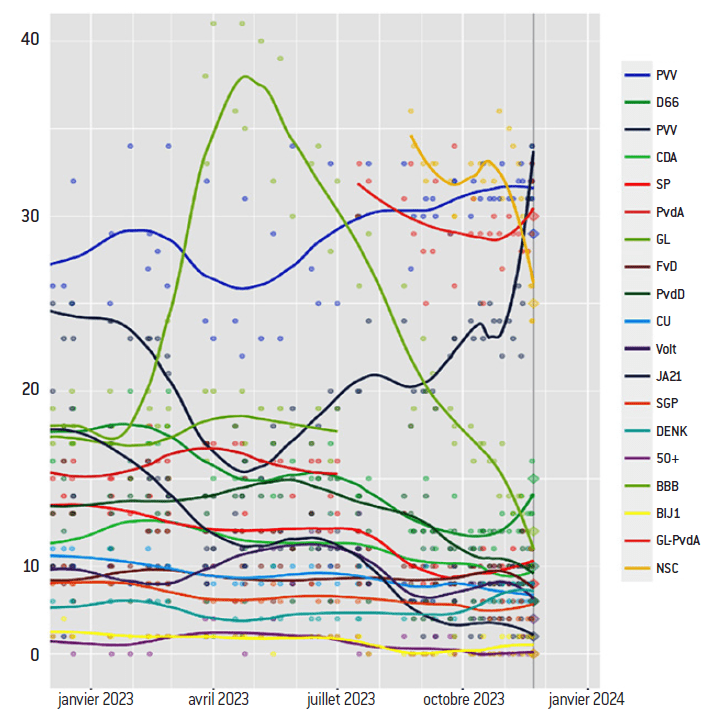 Le recul du VVD, de D66 et du CDA lors des élections à venir était donc probable. De même, la cause de la crise gouvernementale annonçait l’importance du thème migratoire dans l’agenda électoral. Enfin et surtout, si l’ordre d’arrivée final des grandes formations est resté longtemps incertain, deux tendances étaient perceptibles dès avant le scrutin : tout d’abord la montée en puissance accélérée du PVV, qui rivalisait en fin de campagne avec les libéraux comme avec la liste d’union de la gauche entre écologistes de Groenlinks (la gauche verte) et sociaux-démocrates du PvdA (Parti du travail) : trio suivi par le nouveau parti de centre droit, le NSC (Nouveau Contrat social) de Pieter Omtzigt, l’homme qui monte dans l’opinion depuis quelques années, parlementaire très expérimenté et ancien du CDA. Enfin et surtout, tous les sondages montraient la nette droitisation de l’électorat, dont les intentions de vote allaient au moins à 60% aux partis de droite, toutes tendances confondues. Dans ces conditions, l’espoir d’une victoire de la liste GL/PvdA relevait du voeu pieux, car, même si par l’effet du mode de scrutin et l’extrême dispersion de l’offre électorale (20 formations concouraient) ce parti pouvait arriver en tête au soir du 22 novembre, il était hors d’état de constituer une coalition de gauche, annoncée autour de 35% des voix, centre-gauche compris.