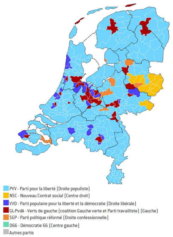 La tonalité générale des commentaires qui ont suivi les dernières élections néerlandaises du 22 novembre 2023 a été celle de la surprise devant la large victoire du parti d’extrême droite, le PVV (Partij voor de Vrijheid « Parti pour la liberté ») de Geert Wilders. Avec 23,5% des voix et 37 sièges sur 150, il a connu un succès sans précédent dans son histoire.