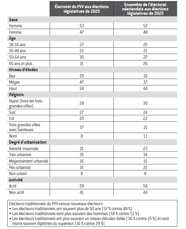La surreprésentation de la population au faible niveau d’études (formations professionnelles courtes) et, de ce fait, un niveau moyen de revenu moindre dans une « économie de la connaissance » (kenniseconomie) distinguent encore le PVV des partis traditionnels, mais l’évolution globale tend à en faire un catch-all party recueillant de multiples motifs de mécontentement et de multiples profils de mécontents.