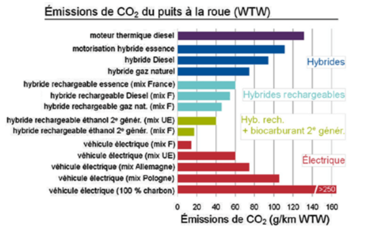Enfin, le bilan carbone du véhicule électrique, présenté comme la solution à tous ces maux, peut être similaire, voire plus défavorable, à celui du véhicule thermique selon l’origine de l’électricité, par exemple lorsqu’elle est produite à partir de centrales au charbon, et compte tenu des difficultés de fabrication et de recyclage des batteries, particulièrement polluantes. Un certain nombre de données (voir graphiques 1 à 3) permettent de relativiser le discours ambiant sur le véhicule électrique, surtout lorsque l’on sait qu’en moyenne une voiture parcourt environ 13.000 kilomètres par an. Affirmer que la voiture diesel est seule responsable de la pollution de l’air et que la solution miracle est le véhicule électrique est donc incorrect.
