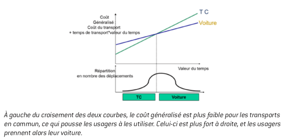 Les économistes des transports ont depuis longtemps modélisé les mécanismes de comportements modaux des personnes avec la notion de coût généralisé (voir graphique 11) : en ajoutant au coût du transport la valorisation du temps par les usagers (en moyenne aux alentours de 10 euros par heure), on comprend comment s’opèrent les choix de mode de transport.
