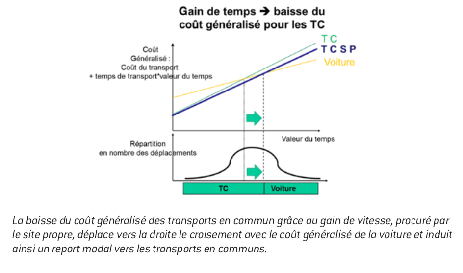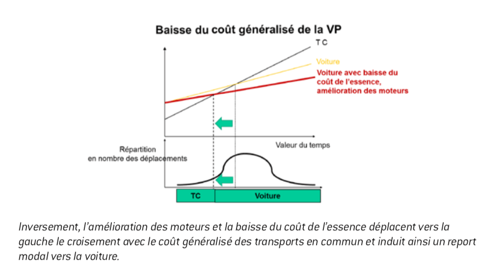 - l’impact de la baisse du coût d’usage de la voiture est bien mis en évidence : passer de 0,22 euro à 0,11 euro au kilomètre va mettre ce coût d’usage à niveau équivalent à celui des transports en commun. Hors heures de pointes, la vitesse moyenne de la voiture étant équivalente à celle du transport en commun de surface (bus et tramways), l’usager va être incité à l’utiliser plus fortement qu’aujourd’hui ;