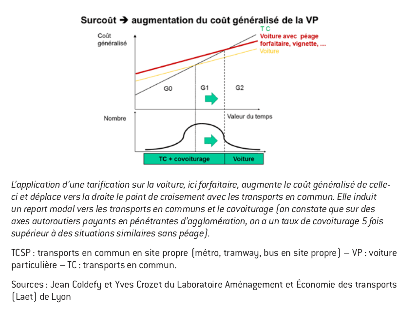 Ce type de mesure rééquilibre la baisse du coût d’usage de la voiture, maintient la liberté de circulation des personnes et a un impact réel sur le volume de trafic. Elle permet aussi de financer les infrastructures et les services de mobilité, permettant ainsi d’avoir des alternatives efficaces à la voiture solo, dont les agglomérations ont tant besoin pour accompagner leur développement. C’est d’ailleurs très exactement la proposition des députés Gilles Savary et Bertrand Pancher dans un rapport sur le système ferroviaire25.