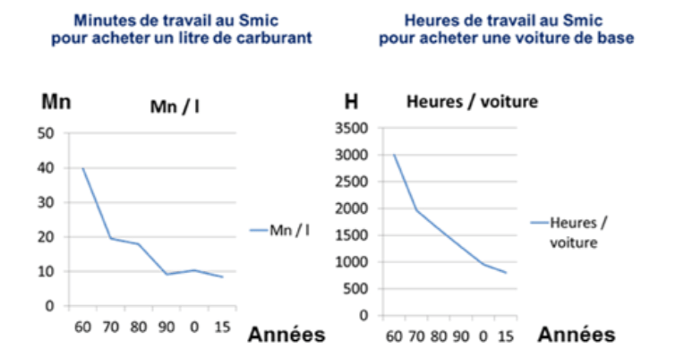 Pourtant, malgré ces investissements, l’Insee et les métropoles constatent un accroissement del’usage de la voiture pour accéder au territoire8. La raison est simple : la diminution du coût d’usage de la voiture. Si l’on compare à prix constant le prix de l’essence entre 1970 et 2016, onconstate qu’on peut aujourd’hui en acheter deux fois et demie plus avec 1 heure de smic (voir graphique 4). La consommation des véhicules a par ailleurs été réduite de moitié sur la mêmepériode. Le prix du pétrole, compte tenu de l’explosion à la hausse des réserves, a été divisé pardeux en quelques années et devrait durablement s’établir aux alentours de 60 dollars le baril, hors contraintes géopolitiques.