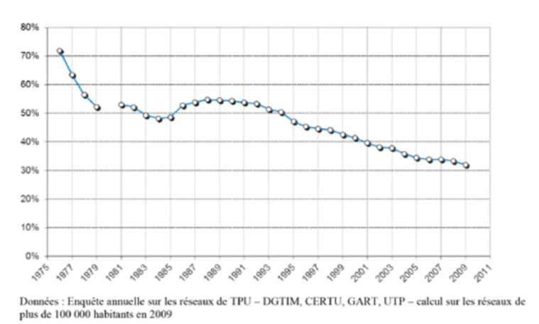 Le principal problème des transports en commun se trouve dans leur coût pour les budgets publics. En France, les usagers ne financent en moyenne que 20% des coûts d’exploitation des transports en commun14. Il n’en a pas toujours été ainsi : en 1975, les usagers finançaient 75% des coûts d’usage du transport public, comme en Allemagne aujourd’hui. La dérive opérée depuis l’a été tout autant sur l’augmentation de l’offre (qu’une politique tarifaire n’a pas su rendre plus supportable pour les fonds publics) que sur la dérive des coûts d’exploitation. Entre 1975 et 2014, en euros constants, il faut quatre fois plus d’argent public pour le même voyage réalisé. En effet, si la recette par voyage tarifaire a baissé de 35% (de 0,74 à 0,48 euros par voyage), la dépense, elle, a augmenté de 50% (de 1 à 1,50 euros par voyage)15. Cette dégradation a été compensée par une augmentation du versement transport, donc du coût du travail. Il est important de souligner une exception notable à ce triste tableau, Lyon, où le ratio recettes sur dépenses est de 60% grâce àune tarification adaptée et une maîtrise des coûts opérée par la collectivité (les tarifs sont inférieurs à ceux de la Région Île-de-France etcomparables à d’autres agglomérations). Preuve que l’on peut maîtriser les dépenses et ajuster les recettes tout en maintenant une bonne qualité du service public.