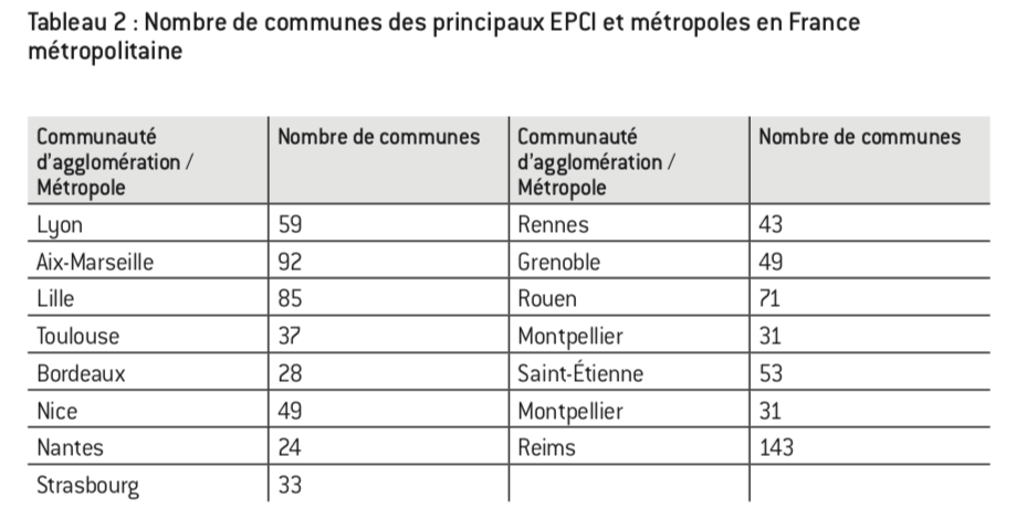 Tableau 2 : Nombre de communes des principaux EPCI et métropoles en France métropolitaine