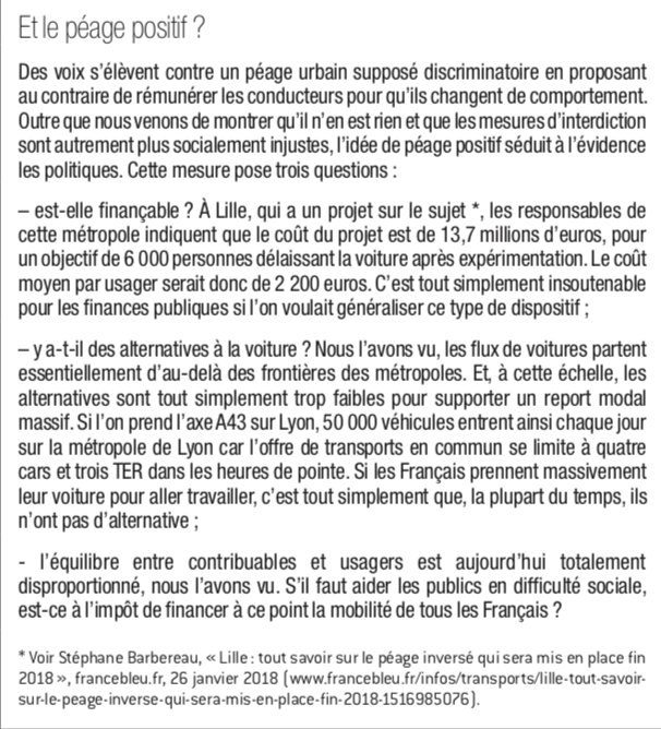- mais aussi la population – nous sommes tous acteurs et responsables de la situation que connaissent nos agglomérations. On utilise mieux ce que l’on paie et l’usager doit davantage contribuer au coût de sa mobilité, ce qui éviterait des déplacements inutiles ou permettrait de mieux les Une redevance sur l’usage de la voirie semble la seule solution pour reprendre à la voiture les gains financiers obtenus par la baisse des prix du pétrole et l’amélioration de la performance des moteurs. Elle permettrait de financer les investissements dont nos agglomérations ont tant besoin.Pour des villes plus respirables et des mobilités raisonnées, il faut avoir le courage de mettre toutes les options sur la table et conduire les débats de manière publique, sans idéologie, afin que les choix soient partagés et acceptés. À chaque mode de transport sa zone de pertinence. Rejeter la voiture par principe n’a pas de sens en périphérie alors que les transports en commun dans ces zones ne sont pas toujours ni finançables ni efficaces. A contrario, l’usage excessif de la voiture est réel et doit être combattu. Avec ces mesures, villes et voitures, centres et périphéries peuvent ainsi être réconciliés. Le chemin sera long pour faire rentrer une culture économique dans nos politiques de mobilité visant à modifier nos comportements. Mais face à l’urgence climatique, avons- nous vraiment le choix ?