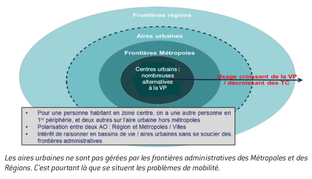Cependant, aucune structure publique ne gère les bassins de vie que sont les aires urbaines; au contraire, une gestion territoriale trop étroite, oubliant que la mobilité c’est d’abord des flux, laisse l’hinterland des métropoles sans solutions alternatives à la voiture. Il ne sert à rien de se lamenter sur la part excessive de la voiture dans les déplacements domicile-travail (75% des Français contre 11% pour les transports en commun13) si, dans le même temps, le système public n’est pas capable de déployer des alternatives.