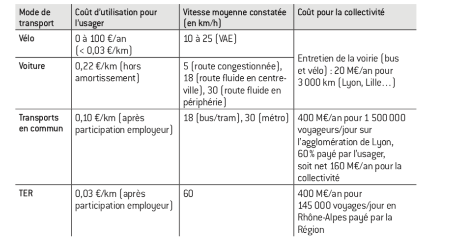 - les données illustrent bien la performance du vélo par rapport à l’autre transport individuel qu’est la voiture : vitesse moyenne comparable en ville, sans temps de stationnement, et coût évidemment inférieur. Pour des distances inférieures à 5 kilomètres, voire à 10 kilomètres avec un vélo à assistance électrique, c’est l’outil idéal tant pour l’individu que pour la collectivité, compte tenu de son faible encombrement et de son impact environnemental quasi nul ;
