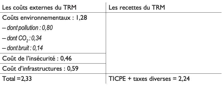 Tableau 2 : Coûts externes et recettes du transport routier de marchandises (TRM) sur l’ensemble du réseau (en centimes d’euro par tonne-kilomètre).