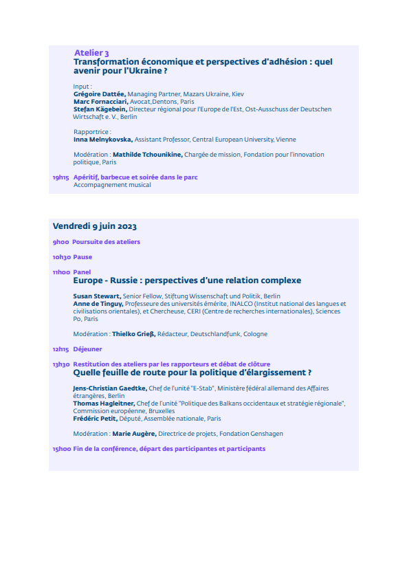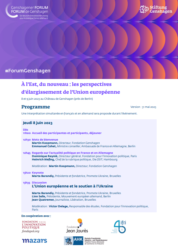 Les 8 et 9 juin 2023, la Fondation Genshagen a organisé le onzième Forum de Genshagen sur le thème « À l’Est, du nouveau : les perspectives d’élargissement de l’Union européenne », dont la Fondation pour l'innovation politique était partenaire.