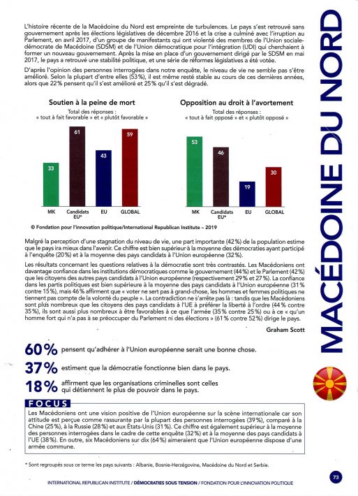Le 19 juin 2019, la Fondation pour l’innovation politique s’est rendue à Skopje en Macédoine du Nord pour présenter son enquête planétaire, Démocraties sous tension, réalisée en partenariat avec l’International Republican Institute (IRI).